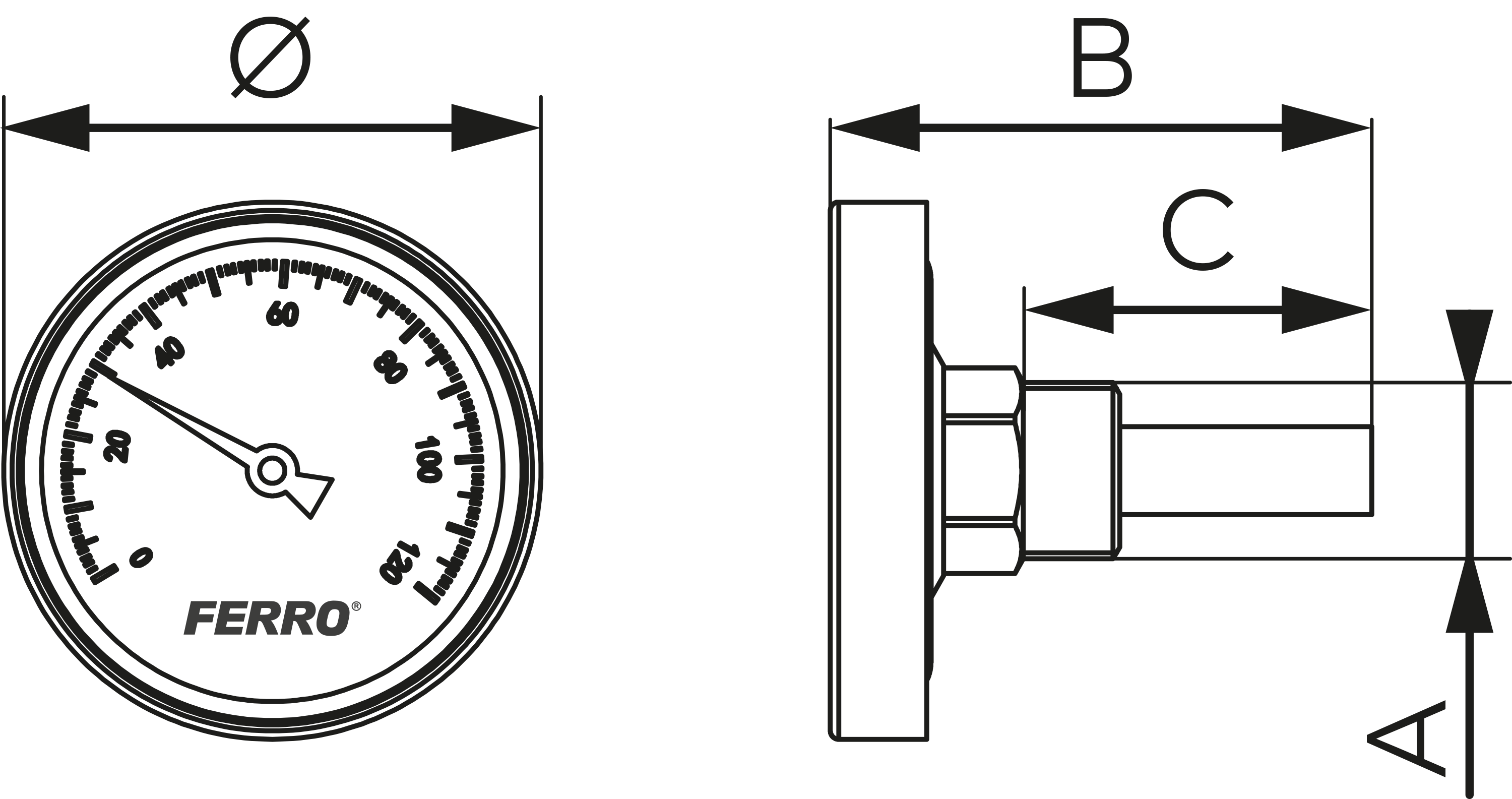 AXIAL THERMOMETER • GALVANIZED STEEL BODY • COVER: SCRATCH DURABLE MATERIAL • ALUMINUM POWDER COATING • BIMETALLIC THERMOMETER • BODY DIAMETER: 63 MM • RANGE: 0-120 ° C • CONNECTION: BRASS SINK 40 MM - 1/2 " AT THE BACK